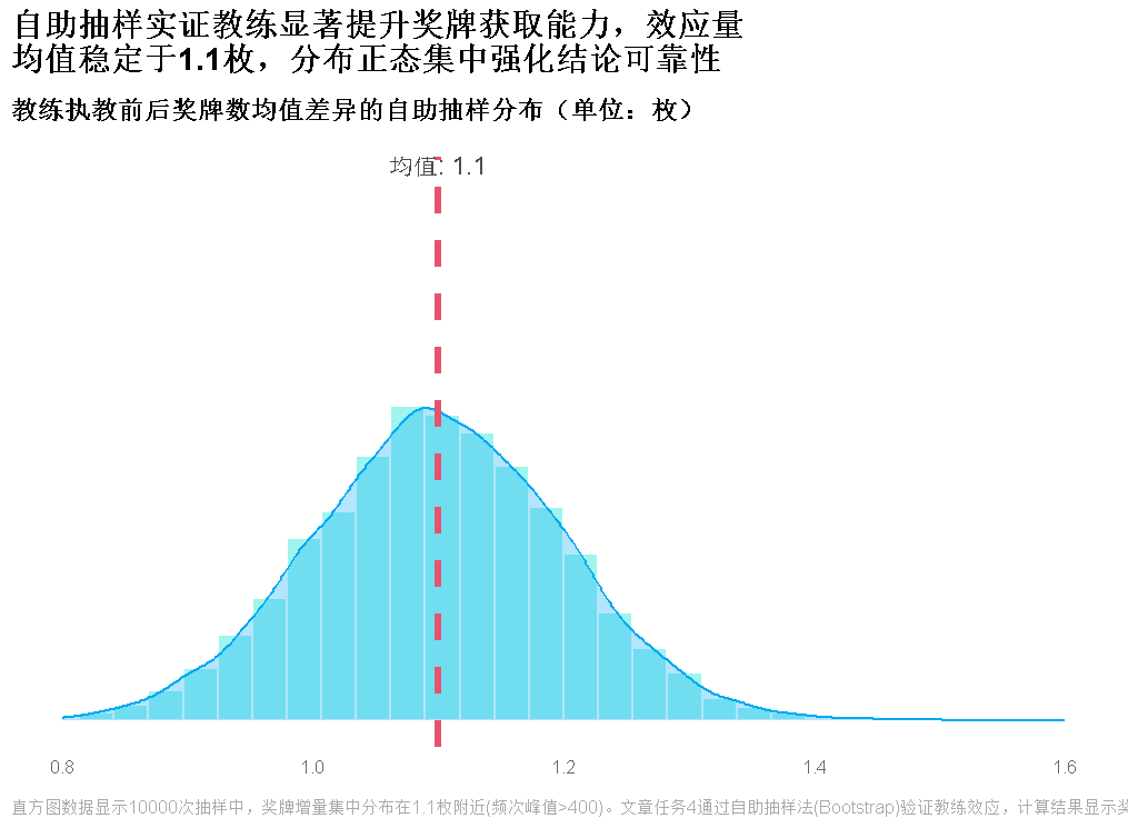 2. 自助抽样法(美国女排):10000次重采样显示,执教后奖牌数均值提升1.0-1.2枚,积极影响概率100%