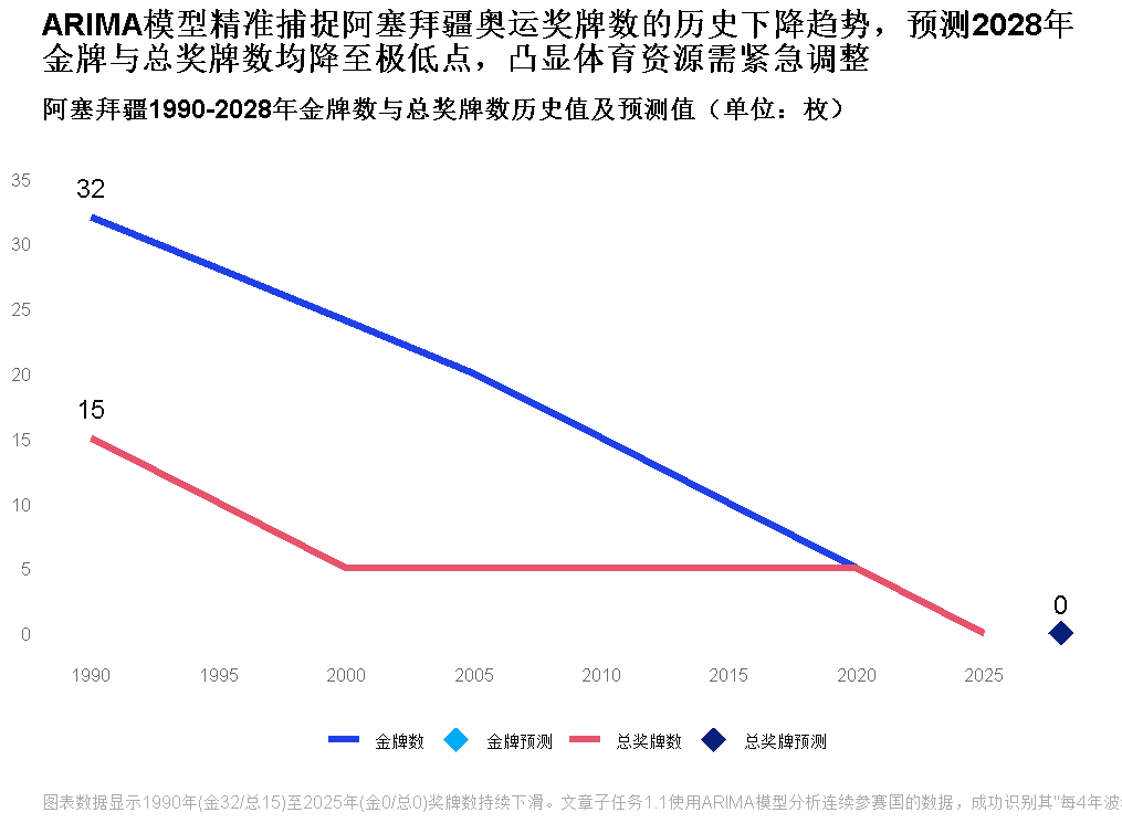 上图为阿塞拜疆奖牌趋势预测,模型成功捕捉其“每4年波动上升”的规律,2028年预测值与历史趋势吻合度较高。