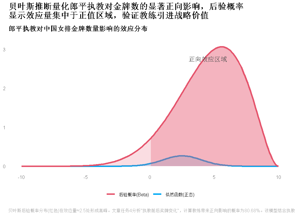 1. 贝叶斯推断(中国女排):结合“执教前后奖牌数据”与先验假设,计算积极影响概率约80.68%