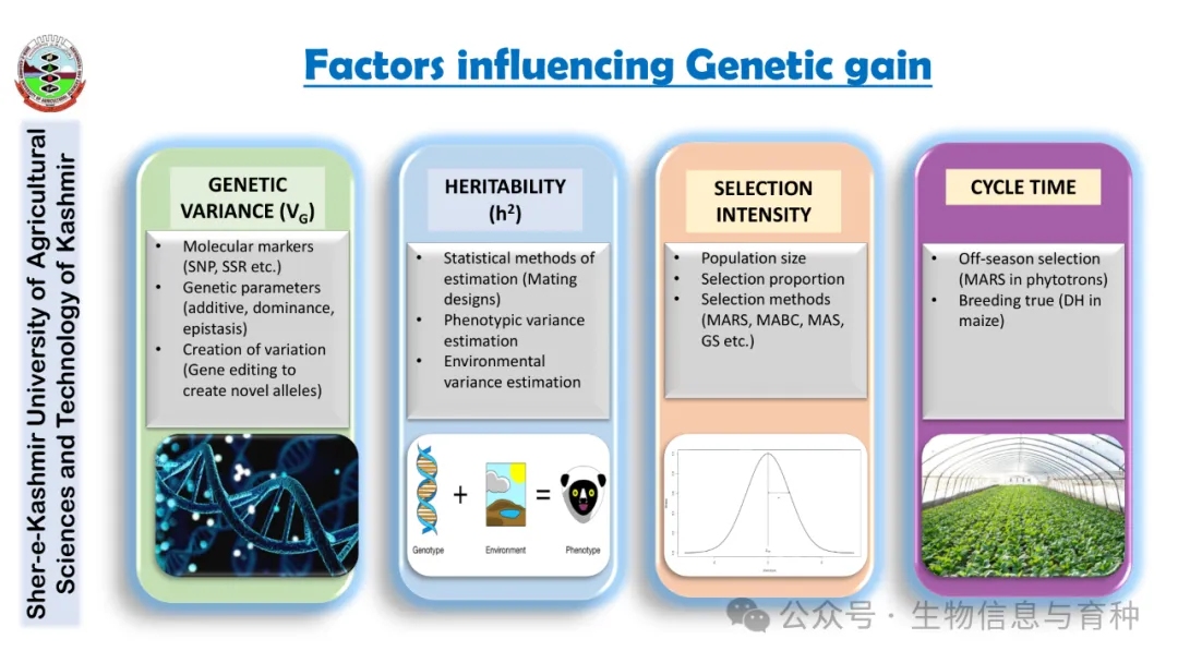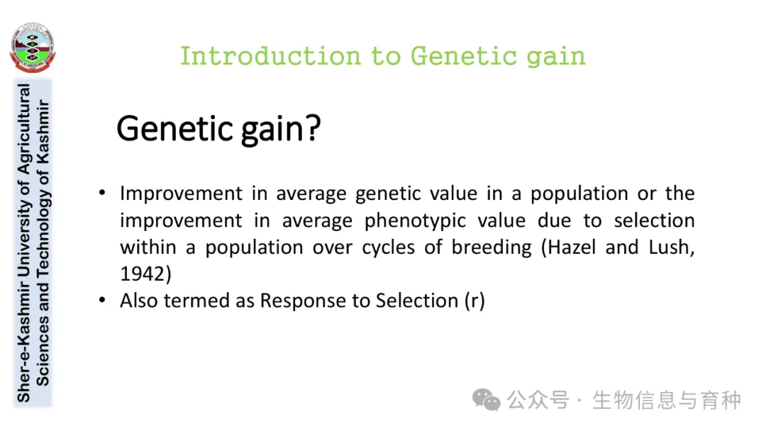 - • 遗传增益(Genetic Gain):指通过育种选择,在群体中平均遗传值或表型值的提升。