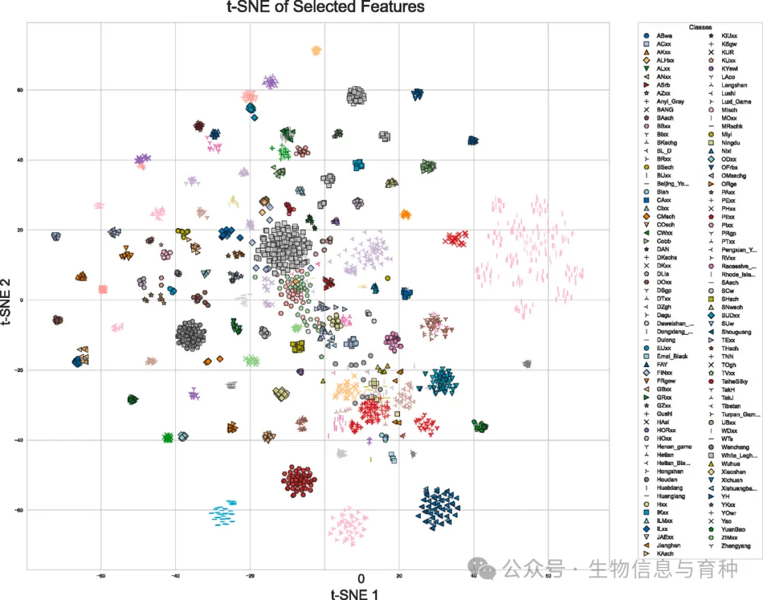 - • 鉴定系统可视化:利用t-SNE方法对MLR方法筛选的2000个SNP进行品种鉴定结果可视化。
